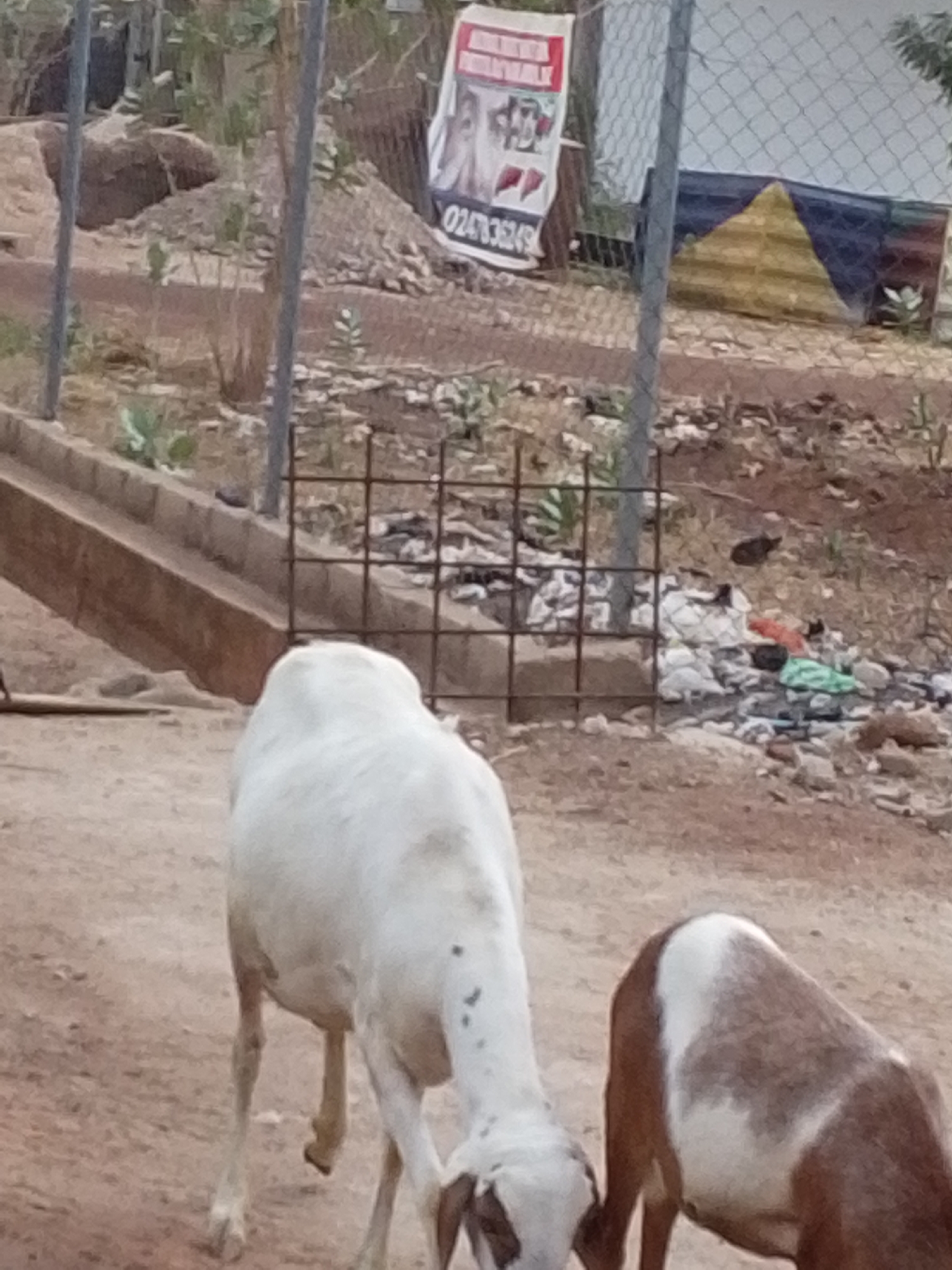 Two goats are in the foreground. The goat on the left is white with dark speckles. The goat on the right is brown with white. Behind them is a brown dirt ground, and a partially visible concrete trough on the left of the image. A low fence behind the goats appears to be made of thin steel bars. Litter is visible behind the fence. A large poster, with the number 0247836249 on it, is attached to a chain link fence. Behind the fence is a multi-colored triangle. The location appears to be Tamale, Ghana.