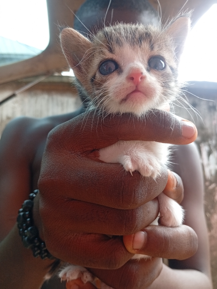 - "In Akpaka Forest Reser, Nigeria, a small kitten, predominantly white with brown and grey tabby markings on its head and back, is held by two dark-skinned hands" by FM-kq12i1, licensed under CC BY 4.0