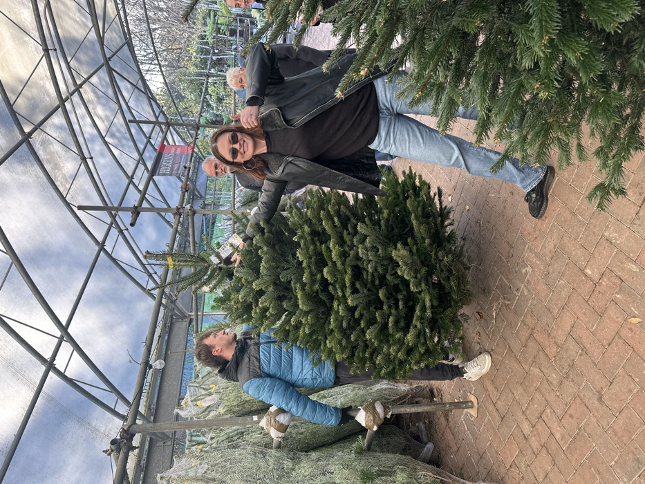 The image captures an interior scene at Higgins Garden Centre in Pembury, Tunbridge Wells, United Kingdom. The setting is a large greenhouse or polytunnel structure with a translucent roof and metal framework, under an overcast sky. The floor is paved with reddish-brown bricks arranged in a herringbone pattern. In the foreground, a woman with dark hair, wearing sunglasses, a dark leather-like jacket, a black top, light blue jeans, and dark shoes, smiles broadly at the camera. She extends her right arm with a thumbs-up gesture and her left arm towards a prominent, unwrapped, green Christmas tree positioned in the center. Behind and to the left of this tree, a man in a blue and black puffer jacket, dark trousers, and light sneakers, holds the tree's trunk or its metal stand with both hands, looking towards the right side of the frame. A white price tag is visible hanging from a branch of the central tree. Several other individuals are present in the mid-ground and background. An older man with a grey beard stands behind the primary woman, looking towards the right. Further behind him, a partially visible older woman and another partially visible man are also present. To the far left, a dense array of Christmas trees, many individually wrapped in white netting, are displayed upright. A red and white sign bearing the name "HIGGINS" is visible affixed to the overhead metal structure. An exposed lightbulb hangs from the framework.