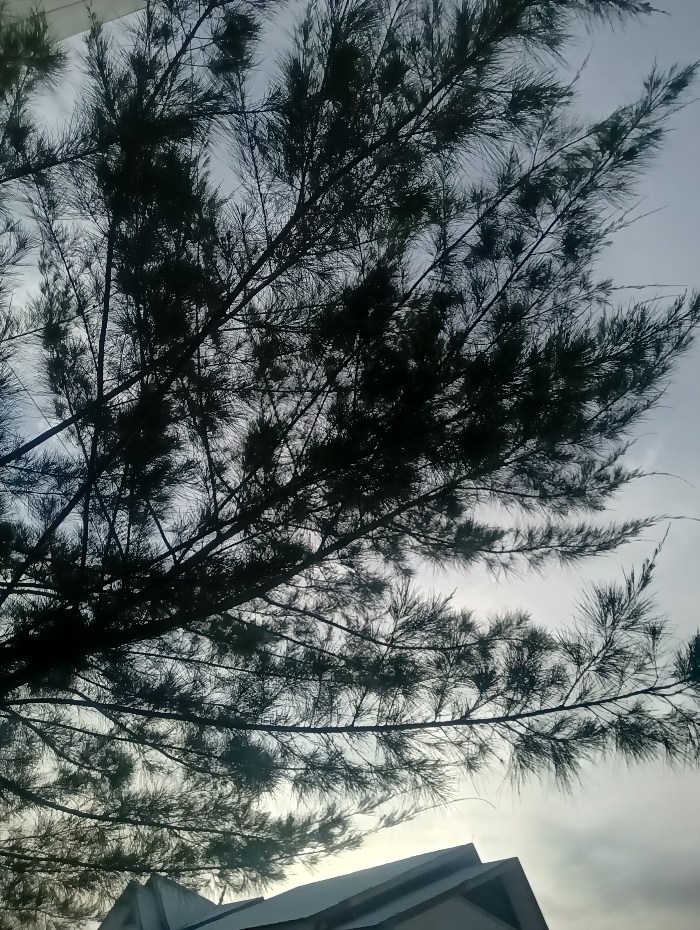 A silhouette of a tree with wispy, needle-like leaves dominates the frame against a cloudy sky. The branches extend in various directions, creating a dense, dark pattern. Below, a portion of a white building with a sloped roof is visible. The overall composition is a study in contrasts, with the delicate foliage standing out against the pale sky and the solid structure of the building.