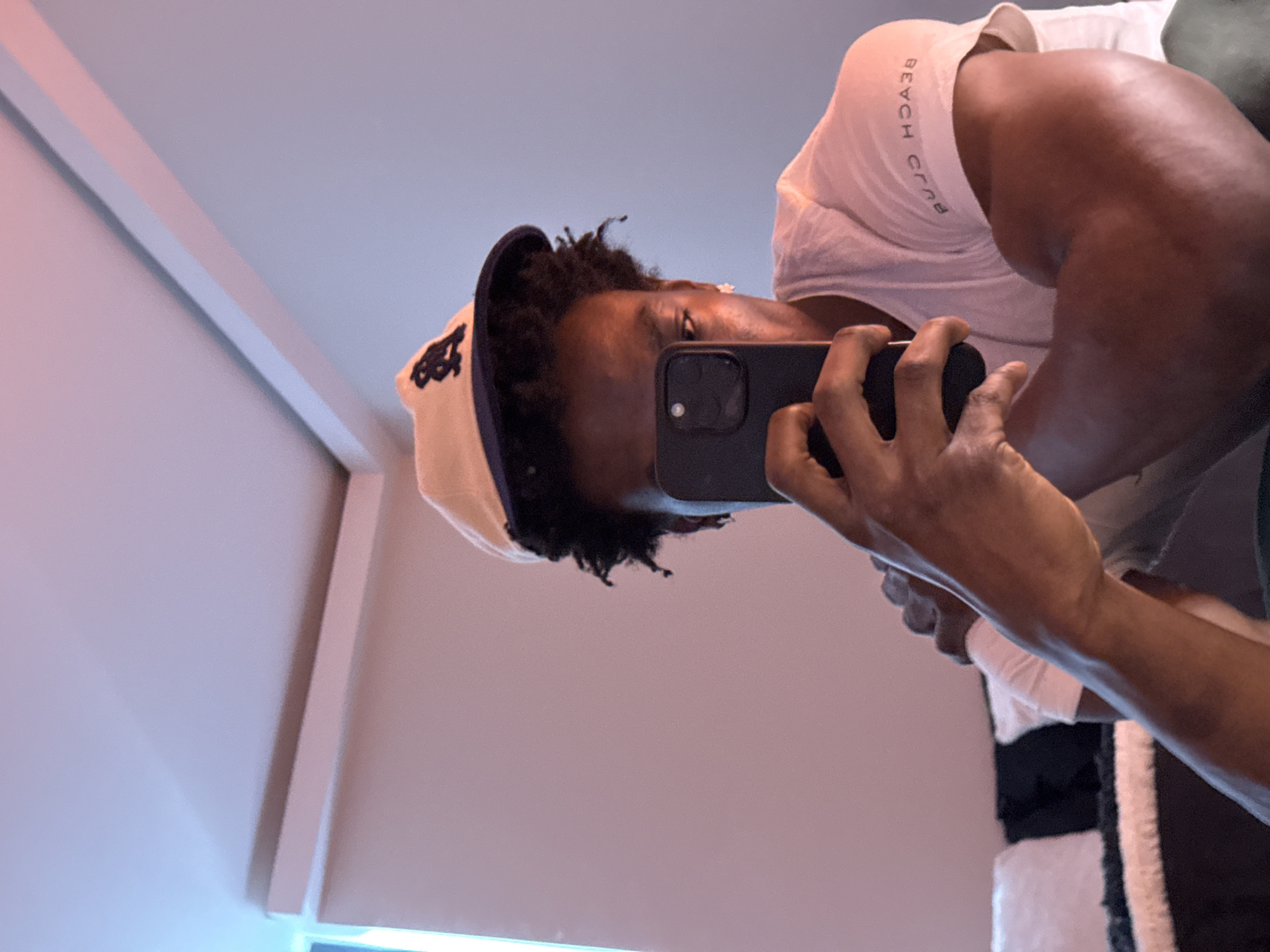 This image depicts a mirror selfie of a young adult male within an indoor setting in the city of London, United Kingdom. The subject, of dark complexion with short, dark, curly hair, is wearing a light-colored baseball cap featuring a dark brim and a dark emblem, along with a white t-shirt displaying the reversed text "BEACH CLUB" on the right sleeve. A small stud earring is visible in his right ear. He holds a dark-colored smartphone, equipped with multiple camera lenses, in both hands, positioning it directly in front of his face, largely obscuring his features except for a segment of his right eye. His left bicep displays muscular definition. The background consists of a plain, light-toned wall and ceiling, with artificial lighting casting a blue-purple hue on the upper section and a pink-orange warmth below. A dark furniture piece, possibly a couch or bed, adorned with textured black and white cushions, is partially visible in the lower left.