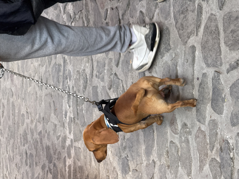 - "A brown dachshund wearing a black harness is seen lying on its back on a stone pavement" by FM-mkaXg2, licensed under CC BY 4.0