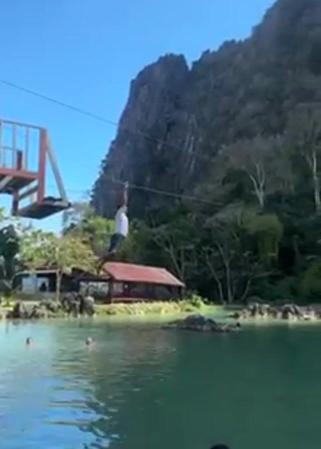 man on a zipline over a body of water. He is wearing a white shirt and dark shorts. As the man on the zipline swings further out over the water, the surrounding landscape comes into view, including people in the water, a building with a red roof and a mountain range covered in lush green trees. The sky is clear and blue.