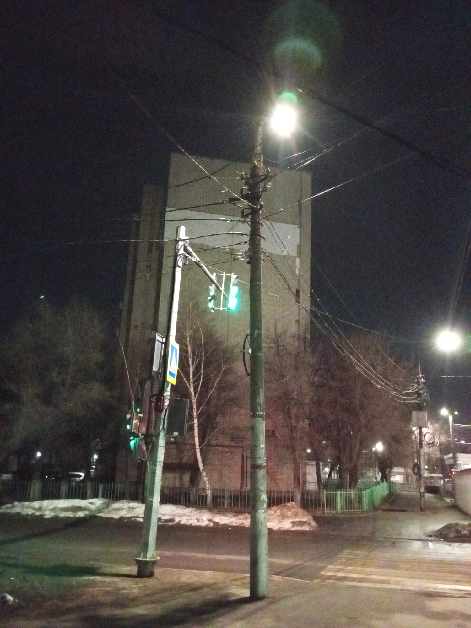 The image depicts a nighttime urban street scene in Saratov, Russia, during what appears to be winter or early spring. The foreground features a wet asphalt road surface with a visible pedestrian crosswalk. Piles of dirty, partially melted snow are present along the roadside and adjacent to a metal fence on the right. A prominent utility pole, heavily laden with multiple overhead wires, stands centrally and is illuminated by its own bright streetlight, which generates a noticeable lens flare. To the left of this central pole, a slimmer pole supports a traffic light displaying a green signal and a blue and white pedestrian crossing sign. In the midground, bare deciduous trees and shrubs line the street, partially behind the aforementioned fence. The background is dominated by a tall, light-colored, multi-story building. The sky is dark. Distant streetlights and a faint vehicle headlight are visible further down the street on the right. No individuals are visible in the frame.