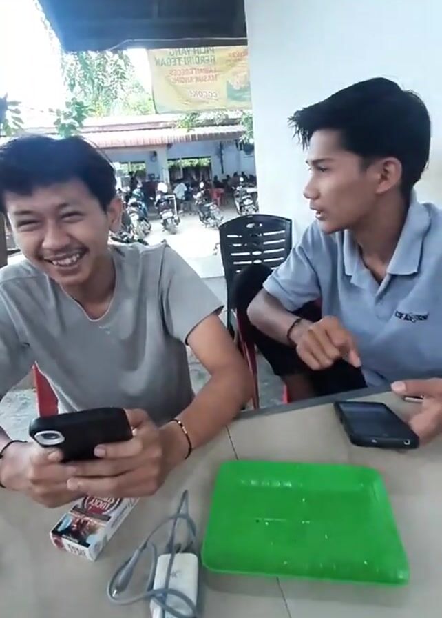 Two young men are sitting at a table outside at a restaurant, each looking at their phones. The man on the left is smiling broadly. He has a pack of cigarettes, a phone charger, and his phone on the table in front of him. The man on the right looks intently at his phone. There is a green plastic container on the table between them. Several motorcycles are parked in the background.