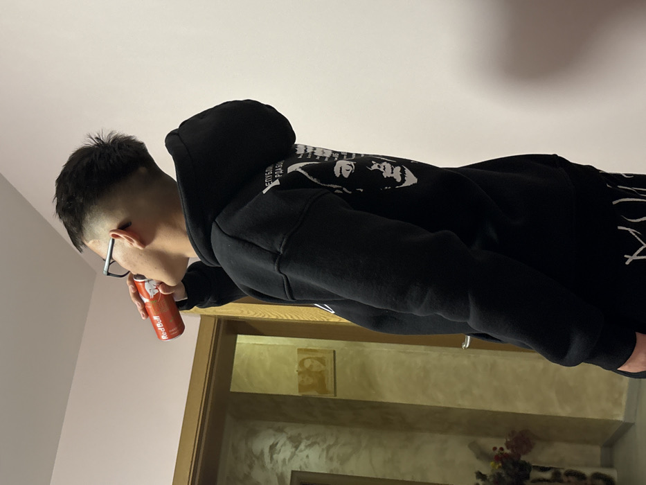 An individual is depicted indoors in Devnya, Bulgaria, captured from the right side. The subject is a young male with short, dark hair styled with a fade haircut, wearing black-rimmed glasses. He is dressed in an oversized black hooded sweatshirt (hoodie) featuring a white graphic print on the upper back, which includes partially visible Cyrillic text, possibly reading "РЕПУБЛИКА" (Republic), and a stylized white depiction of a face or skull. Partially visible below the hoodie are black trousers or sweatpants with white lettering. The individual is actively drinking from a red and white Red Bull energy drink can, holding it to his mouth with his right hand. The background on the left features a light beige or brown wall with a textured finish, a wooden door frame, and a partial view through an open doorway revealing a framed picture or artwork on a distant wall and a tall, decorative vase with dark floral arrangements. The background to the right is a plain, light-colored wall. Artificial illumination is present, casting soft shadows.
