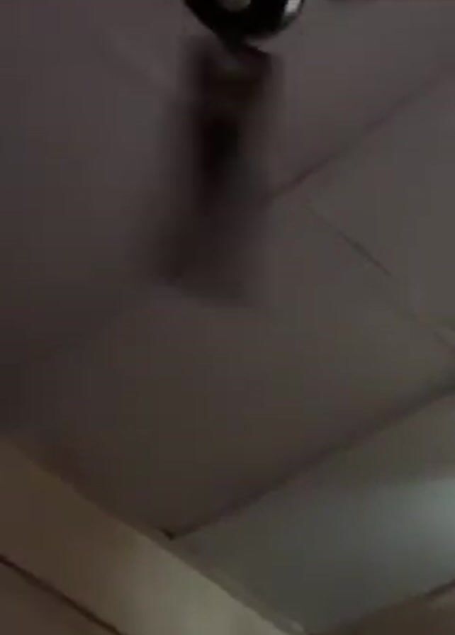 The camera moves upwards, showing a rotating ceiling fan attached to a panelled ceiling. The camera then pans to the right, revealing a lit wall-mounted light fixture and a small table fan hanging on the wall. The walls appear textured and dimly lit.