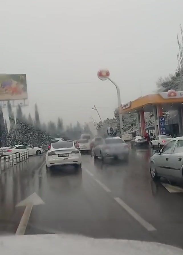 The view from inside a car shows a busy street on a snowy day. Several cars are moving slowly due to traffic and slick conditions. A gas station with a sign that includes "Rompetrol" is visible to the right. A billboard advertising McDonald's is to the left. The road is wet and reflects the surrounding light. The general atmosphere is overcast and cold.