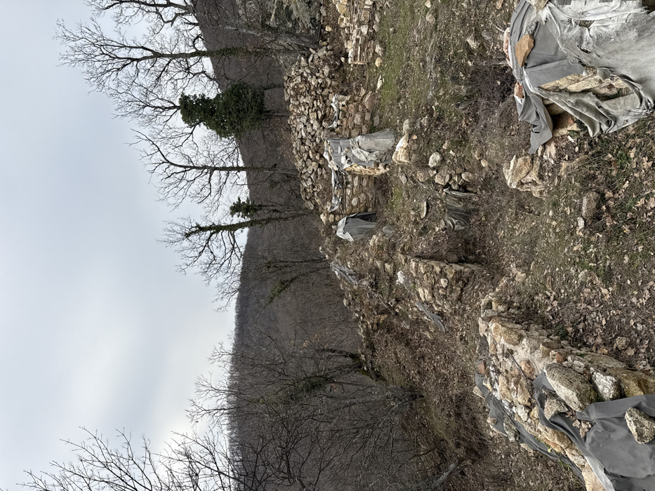 The image displays a sloping, rocky hillside featuring multiple dilapidated stone structures, composed of irregular, light-colored stones. Several segments of these low walls and accumulated rubble are partially covered with weathered, grey tarpaulins. The ground between the structures consists of dry earth, sparse withered grass, and scattered brown leaves. The surrounding terrain is densely covered with bare deciduous trees on distant slopes, with a few evergreen trees interspersed among them. The sky is uniformly overcast and light grey. No individuals, animals, or active interactions are depicted. The scene is situated on a hillside within the city of Unknown, Unknown.