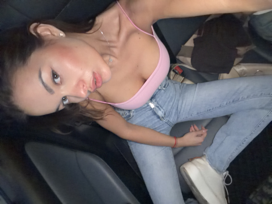 A female individual is depicted seated in the rear compartment of a vehicle, located in Nong Prue Subdistrict, Thailand. She is positioned on dark-colored upholstered seating, with a dark vehicle door panel visible to her left. The subject has dark hair and is wearing a light pink spaghetti-strap top, light blue denim jeans, and white platform sneakers. Accessories include a small stud earring in her right ear, a thin silver-toned necklace with a small square pendant, a red string bracelet on her left wrist, and multiple rings on the fingers of her left hand. Her face is directed towards the camera, with her lips slightly parted. A portion of a seatbelt buckle is visible on the right side of the frame. The scene is illuminated by a direct frontal light source, contrasting with the generally dark interior environment.