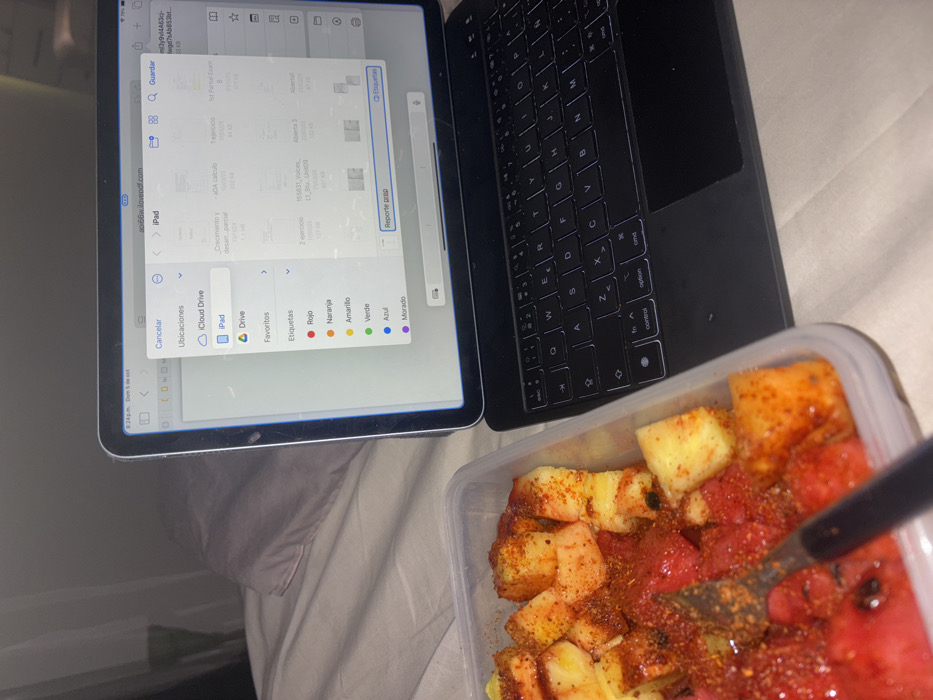 An indoor scene, likely a residential bedroom in Komchén, Mexico, is depicted at night with dim lighting. A silver iPad, connected to a black backlit Magic Keyboard, rests on a light-colored, rumpled comforter. The iPad screen displays a Spanish-language file save dialog from 'ao66w.ilovepdf.com,' showing options for iCloud Drive, iPad, and Google Drive, along with various files and colored tags. The text 'Reporte prep' is visible in the filename input field. To the left of the iPad, a clear rectangular plastic container holds diced fruit, predominantly watermelon and pineapple, heavily coated with a red chili powder. A metal fork is partially submerged in the fruit. The immediate background behind the setup consists of the rumpled comforter, with a blurred, light-colored curtain or sheer fabric visible further in the upper left background.