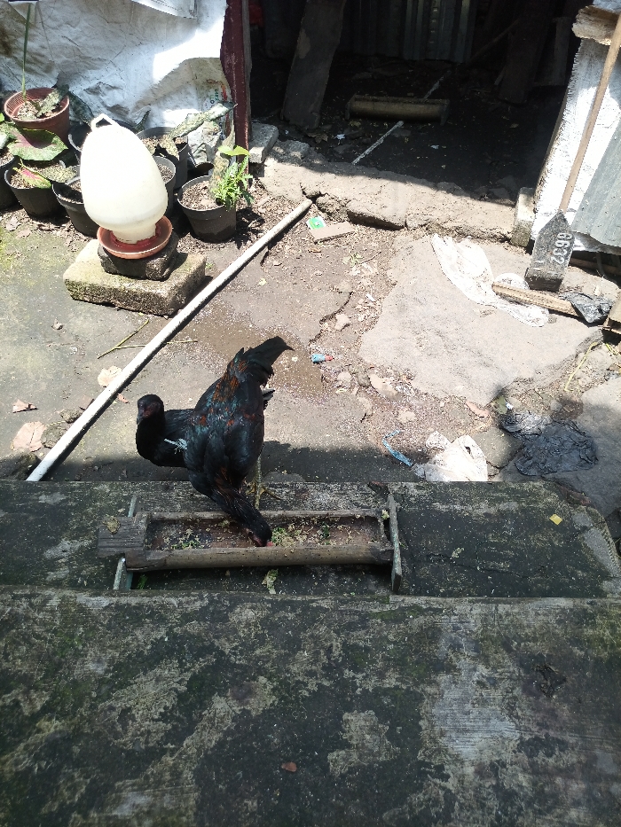 This image depicts an unkempt outdoor area, likely a residential yard or utility space, in the city of Bogor, Indonesia, under bright daylight conditions casting strong shadows. The viewpoint is angled downward from a slightly elevated position. A dark-feathered rooster, exhibiting predominantly black plumage with iridescent green and reddish-brown highlights, is the central subject, positioned in the lower-middle of the frame. It stands with its head lowered into a rectangular, handmade wooden feed trough, actively feeding. The immediate foreground consists of a heavily moss-stained concrete surface, likely a step or platform. Beyond this, the ground transitions to an uneven mix of cracked dirt and rough concrete patches, littered with small debris, including fragments of plastic. In the upper-left, a white, egg-shaped plastic poultry water dispenser, resting on a red base atop two concrete blocks, is visible. It is surrounded by several small plants in black plastic pots, situated against a backdrop of a crinkled white tarp serving as a makeshift wall or cover. A long white PVC pipe lies horizontally across the dirt ground in the midground. To the upper-right, a dark, shaded area indicates the entrance to a rudimentary structure, possibly a shed or storage area, constructed from corrugated metal or rough wood, with loose wooden planks leaning against it. An old, dark metal object, resembling a vintage flat iron with the numbers "6632" visible on it, leans against a surface near this structure. Scattered plastic bags (one white, one black) and other refuse are present on the ground. No people are visible in the scene.