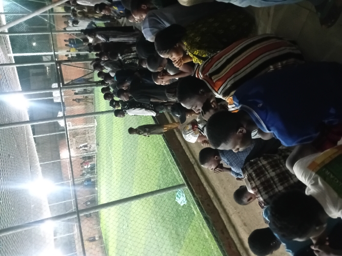 A group of people are seen praying, with heads bowed in reverence, inside what appears to be an indoor sports facility or arena. The green turf, surrounded by a tall chain-link fence, suggests a soccer or similar field. Artificial lights illuminate the scene, casting a glow across the crowd. Several figures are visible in the background, beyond the fence.