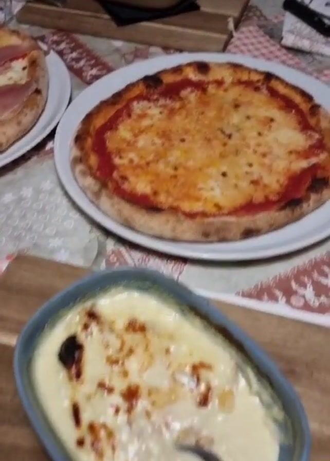 table with a red and white checkered tablecloth, laden with Italian food. There are several pizzas, including one with just cheese and tomato sauce, one with prosciutto, and one with tomato slices. There is also a dish of cheese, and glasses of wine and water. People are seated at the table, and hands are visible. It appears to be a meal at a restaurant.