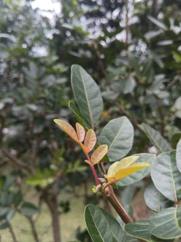 A close-up view of a green bush with a reddish-brown branch in focus. New leaves sprouting from the branch display shades of red, orange, and yellow, contrasting with the mature green leaves. The background shows a blurry green foliage. The image is well-lit, highlighting the textures of the leaves and the branch.