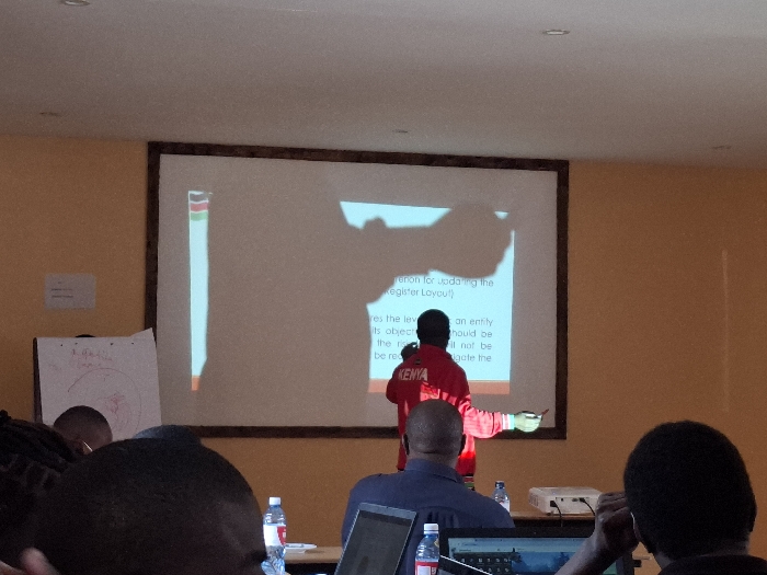 The image depicts a presentation taking place inside a room located in Karagita, Kenya, at coordinates -0.757 latitude and 36.437 longitude. A male presenter, wearing a red shirt with the word "KENYA" printed on it, is standing in front of a screen displaying text about a "register layout" and the flag of Kenya. He is using his right hand to point at the screen as he speaks. The audience, consisting of at least three people, is seated in front of the screen. Laptops are present in the foreground. The room has white walls and a beige ceiling. The lighting in the room appears bright and natural. There is a whiteboard to the left of the screen with an incomplete drawing on it. A bottle of water can be seen on the table. The image captures a moment during a presentation, suggesting that the presenter is providing information or instructions to the audience.