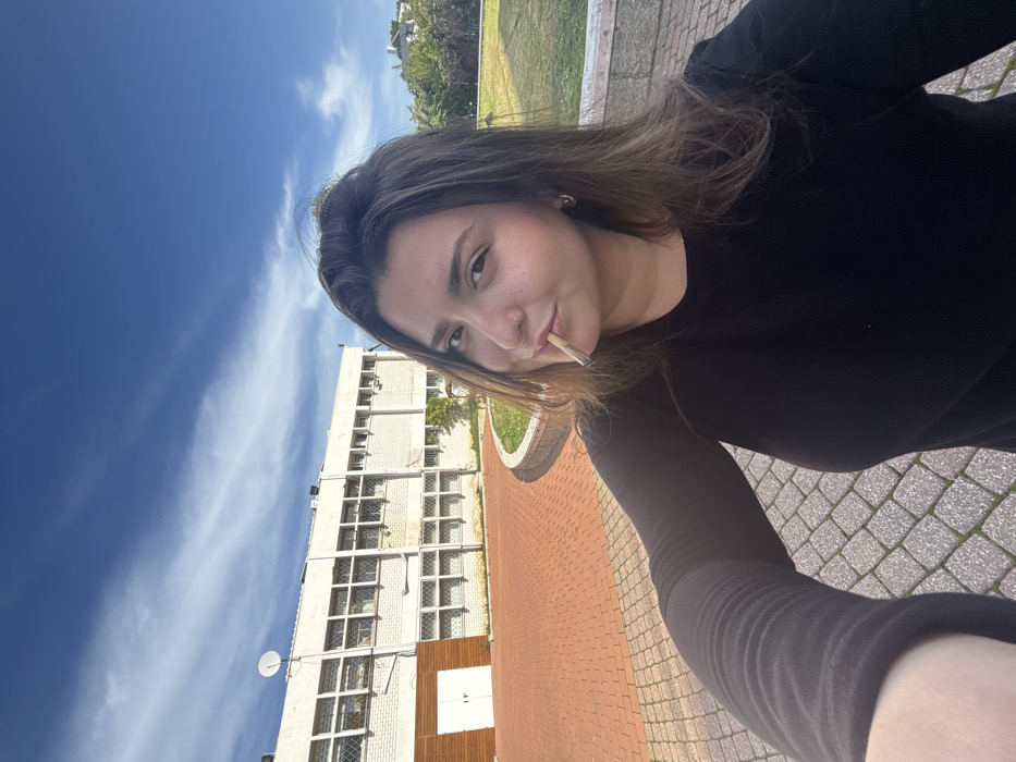 young adult female taking a selfie outdoors in Ramat HaSharon, Israel. She is captured from the chest up, wearing a black long-sleeved top, with medium-brown hair. A nose ring is visible on her left nostril. A hand-rolled cigarette is held between her lips. Her extended arm is visible in the lower left, indicating the selfie action. The background features a two-story, light-colored building with multiple rectangular windows. A white satellite dish is mounted on the upper left portion of the building. The ground directly behind the subject is paved with red-orange interlocking bricks, which curve around a section of green grass. A larger grassy area with trees is visible on the right side of the frame. The scene is set under a blue sky with scattered wispy clouds, illuminated by natural daylight.