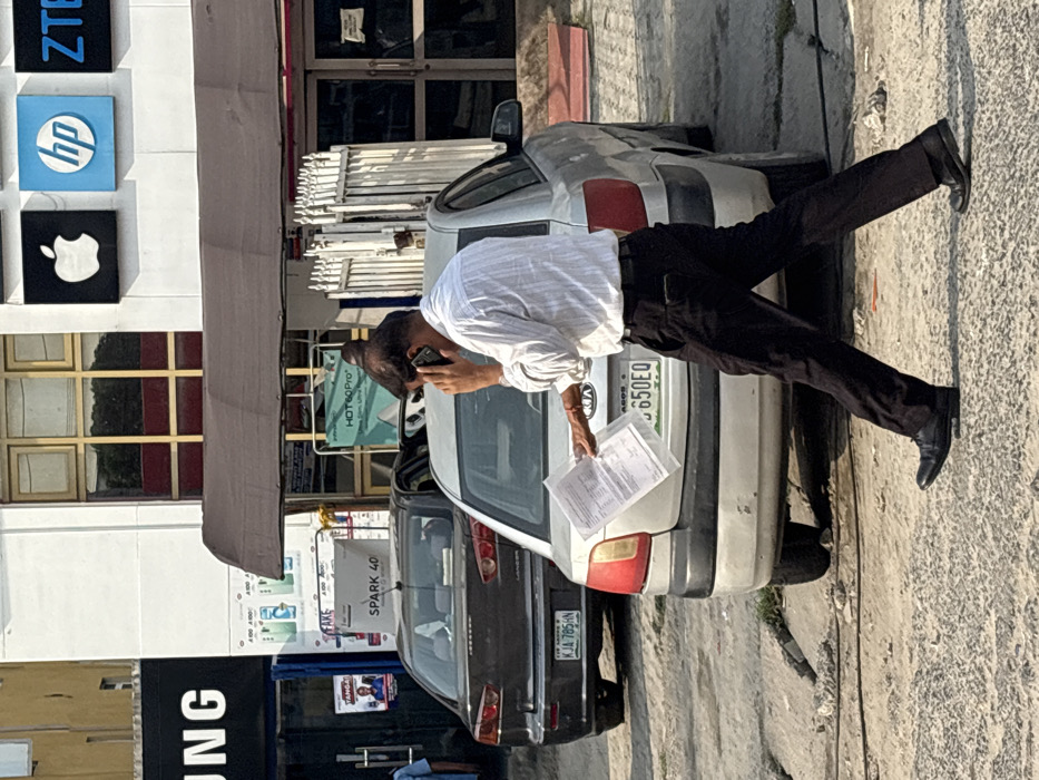 A man in a white shirt and dark pants talks on his phone while holding documents. He stands on the sidewalk next to a silver Kia with license plate 650EQ. Behind the Kia is a dark sedan with plate KJA 785 HN. The background includes a building with signs for Samsung, Apple, HP, and ZTE. There are also signs for Hot 60 Pro and Spark 40 visible.