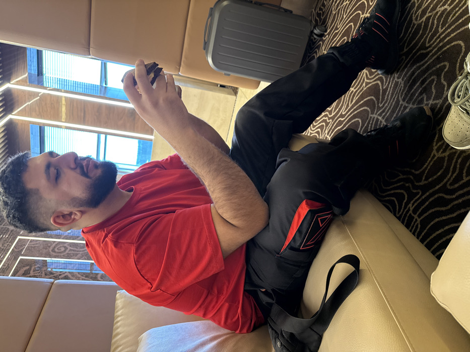 The image depicts an indoor scene in Sukhaya, Russia, featuring a single male subject seated on a light tan, upholstered couch. The man, with a trimmed beard and short dark hair, wears a red short-sleeved t-shirt, black athletic pants with a red and black geometric design on the left thigh, and black athletic shoes with red accents. He is observed holding a dark, multi-layered rectangular object, possibly a food item, with both hands, engaging with it. To his left, on the couch, rests a black strap bag. To his right, on the patterned dark carpet with light wavy lines, stands a grey hard-shell rolling suitcase. The background consists of modern architectural wall panels or pillars in a tan color, interspersed with illuminated vertical panels or windows showing a bright, light blue background. A portion of a grey shoe with white laces is visible in the lower right foreground.