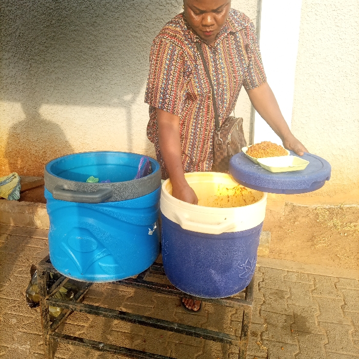 A woman in a patterned shirt serves food from insulated containers. One container is blue with a gray top, the other is blue and white. She holds a plate of food while reaching into the white container. The containers sit on a metal stand. She wears a bag over her shoulder and sandals on her feet. The background is a textured wall.