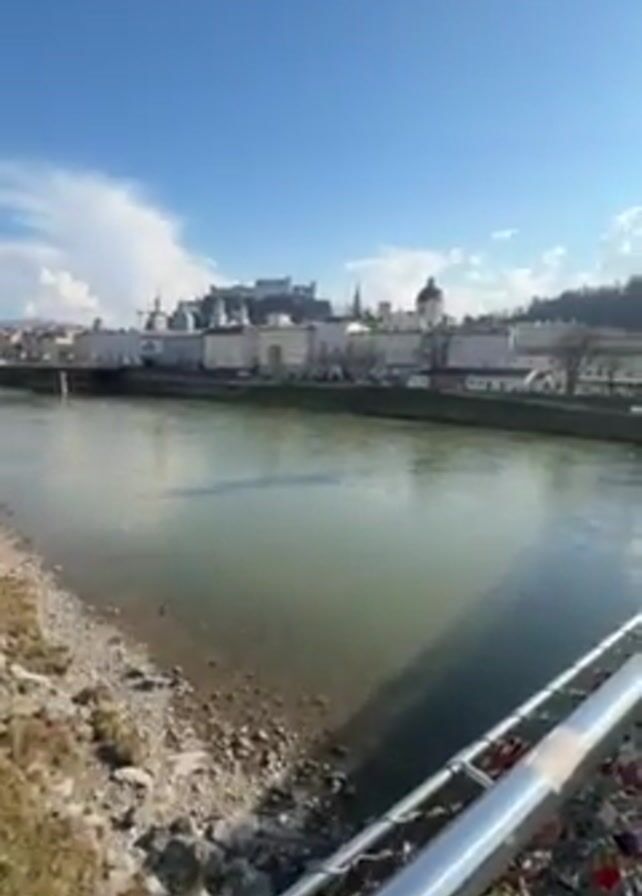 body of water with buildings in the background under a clear blue sky. The camera is looking towards the opposite bank from a bridge. The bridge railing is visible in the foreground, covered with love locks. The water is murky green and there is a rocky, grassy shoreline. The buildings across the river are light colored and appear to be historical. A large castle or fortress sits atop a hill behind the buildings. The camera slowly zooms in on the buildings and fortress. A small sticker with the words "Almost FLY" is visible on one of the bridge rails.