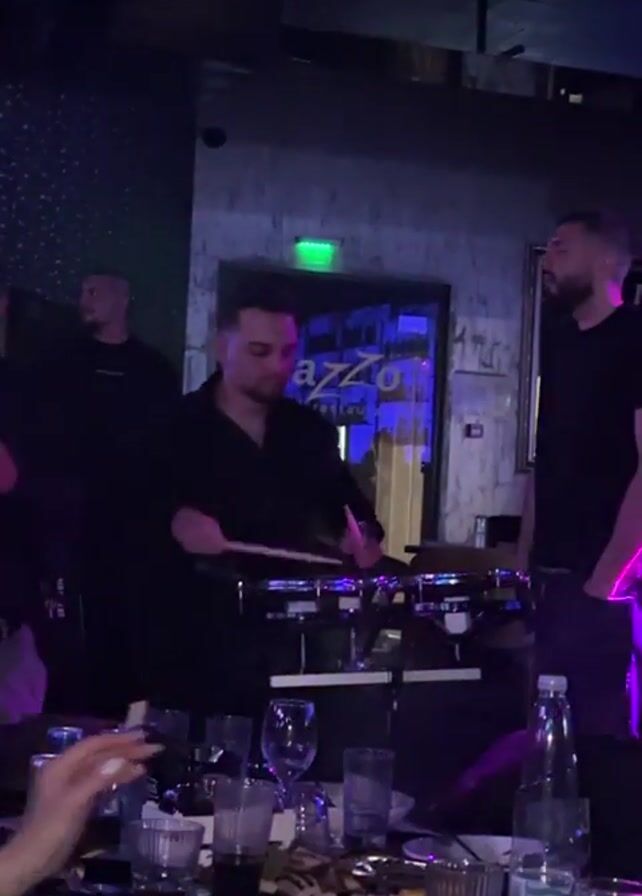 group of people sitting at a table in a dimly lit nightclub. There is a musician playing percussion instruments in the background. Some of the people at the table are holding phones, and there is a hookah on the table. The table also has various drinks, food, and personal items. The atmosphere appears lively with music and socializing.