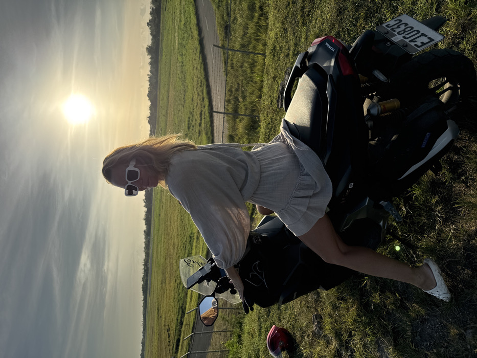 - "A blonde woman wearing oversized white rectangular sunglasses and a light-colored, long-sleeved dress is seated on a dark Honda ADV scooter" by FM-7eaFY2, licensed under CC BY 4.0