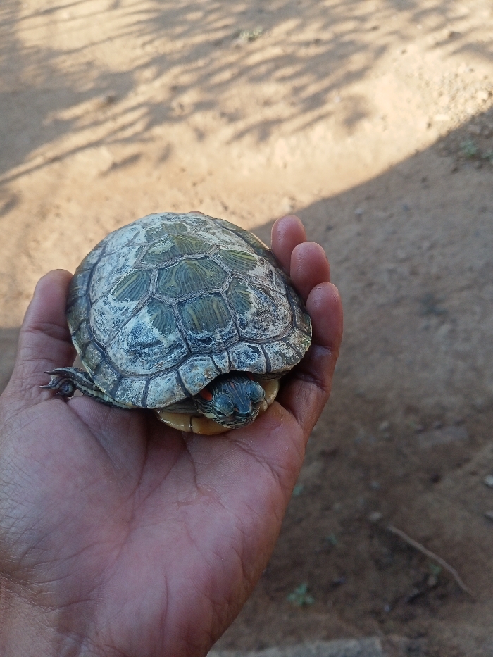 - "A small Red-eared Slider turtle (Trachemys scripta elegans) rests in the open palm of a human's left hand" by FM-cHJi83, licensed under CC BY 4.0