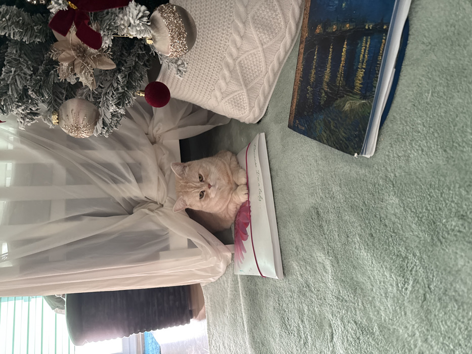 This image depicts an indoor scene within a residence in Blankenfelde, Germany. The primary subject is a light orange-cream colored cat, resembling a British Shorthair, resting centrally in the frame. The cat is positioned on a white envelope or card adorned with a pink gerbera daisy graphic and the text "Because I'm a Lady," secured by a red elastic band. Its front paws are tucked beneath it, and its gaze is directed forward. Behind the cat, a white wooden structure, possibly a crib or a bed frame, is partially visible, draped with sheer white fabric forming a canopy or enclosure. To the right of the cat, a section of a flocked artificial Christmas tree is present, decorated with gold glitter ball ornaments, a red velvet ball ornament, and a gold poinsettia ornament. The base of the tree is covered by a white, cable-knitted tree skirt. The floor is covered with a light green, shaggy rug. In the foreground to the right, a book with a dark blue and gold/yellow abstract cover lies on the rug. In the background, to the left of the white structure, a dark, textured stool or ottoman is partially visible, with a window featuring horizontal blinds behind it, admitting natural light. The visible floor in the background appears to be hardwood. No human subjects are present. The environment suggests a domestic setting, likely decorated for the Christmas season.