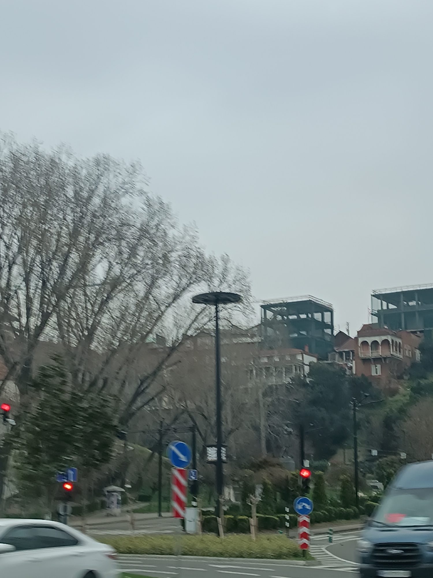 The image displays an urban scene in Tbilisi, Georgia, under an overcast sky. The viewpoint is from a vehicle on a multi-lane road, likely looking towards the Sololaki district. In the foreground, a multi-lane asphalt road occupies the lower portion of the frame. A white sedan is partially visible on the far left, appearing to move right-to-left. A dark blue van is partially visible on the far right, also in motion. Two red traffic lights are visible; one on the far left, partially obscured, and another on the right, above a circular blue traffic sign with a white arrow indicating a compulsory right turn or exit. A red and white striped chevron barrier marks a road division or hazard near the right traffic light. A landscaped median separates lanes, containing low green shrubs and small bare trees. The mid-ground features a park area on the left with numerous tall, bare deciduous trees, their branches forming a dense, intricate pattern. A tall black lamppost with a distinctive, wide, flat circular top stands slightly left of center. Another blue circular sign with a white arrow pointing right is visible within the park. The background consists of a steep hill rising behind the park and road. Residential buildings with red-tiled roofs and traditional arched balconies are situated on the hillside. At the very top of the hill, two large, unfinished building structures with exposed steel or concrete frameworks are prominent, indicating active construction. The sky above is uniformly light gray and overcast.