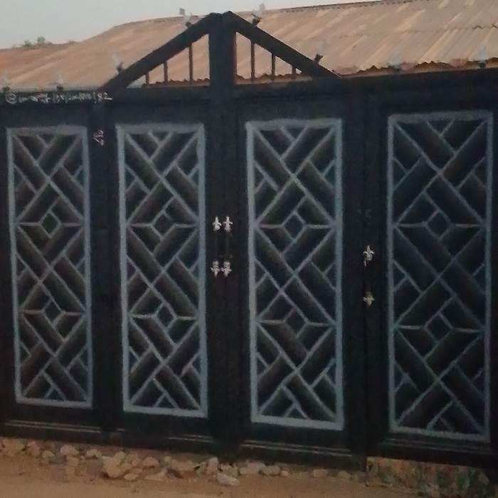 A dark metal gate with an intricate geometric design of intersecting lines and diamond shapes. The gate is divided into four sections, with two sections in the center that meet and have two decorative metal handles on each section. A peaked metal frame tops the gate. Behind the gate, a low-pitched roof is visible. Rocks and dirt are at the base of the gate.