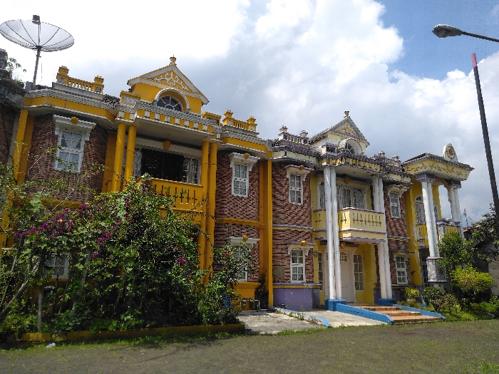 A multi-story, ornate building with yellow structural elements and reddish-brown brick-patterned walls stands under a partly cloudy blue sky
