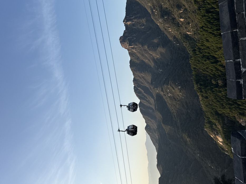 The image displays a panoramic view of a mountainous landscape and a cable car system, observed from the Great Wall in Yanqing District, China