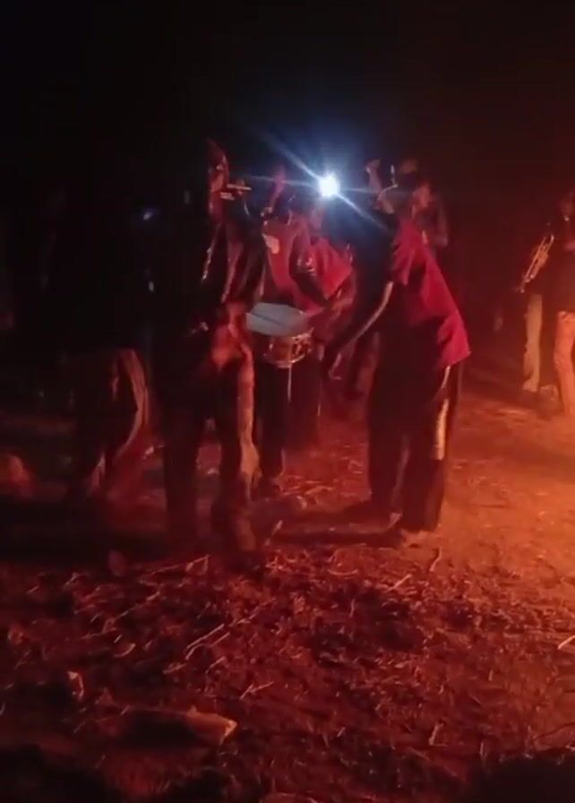 A group of people gathered around a fire in the dark are playing music and dancing. There is a small drum, a trumpet, and other instruments. The ground is dirt with sparse vegetation. The firelight casts orange-red highlights on the people and the ground. The video is somewhat shaky.