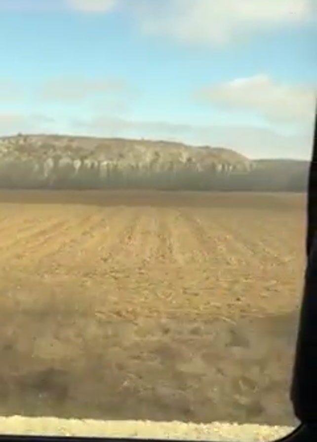 The view from a train window shows a flat, brown field passing by under a blue sky with scattered clouds. In the distance, a line of trees sits atop a low ridge. A black coat hangs from the window frame. The scene suggests a rural or agricultural area.