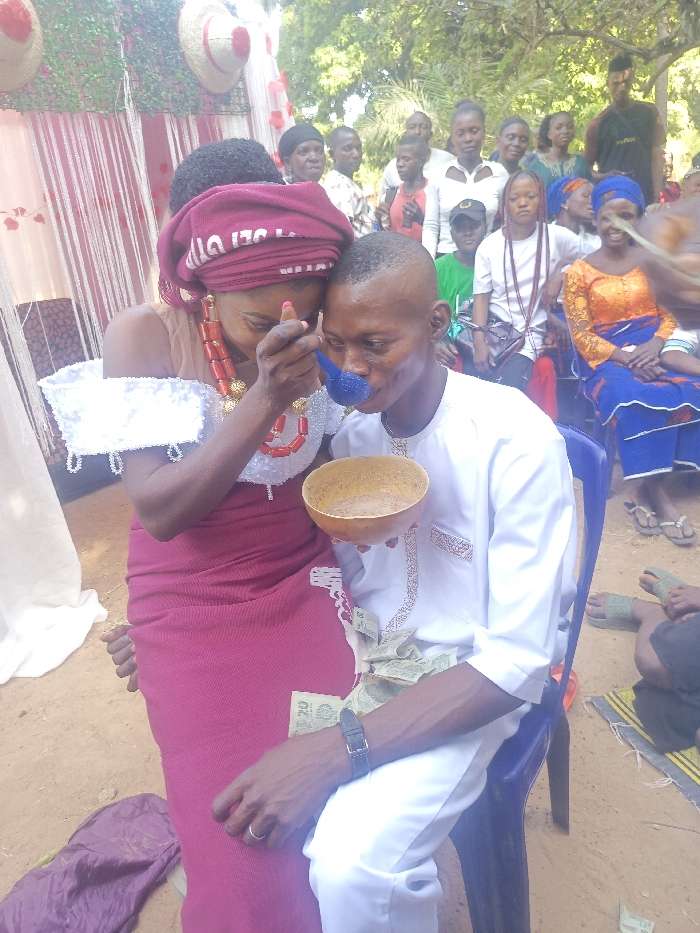 A couple is celebrating a wedding. The bride feeds the groom with a spoon from a wooden bowl. The groom is sitting on a blue chair, with dollar bills on his lap. The bride is wearing a burgundy wrap skirt and a white top. A group of people is watching them. There are decorations of red and white in the background.