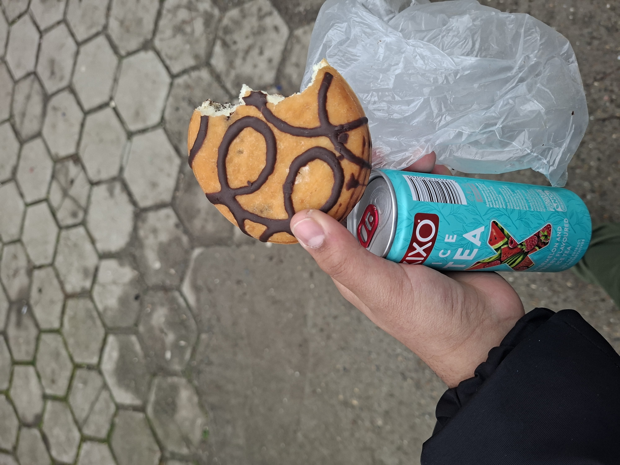 Here is a description of the image: A person is holding a partially eaten donut and a can of iced tea. The donut is round with a brown glaze and dark chocolate swirls. The can of iced tea is light blue and has text and fruit designs on it. There is a clear plastic bag behind the donut and can. The background is a paved walkway with grey hexagonal stones. The location appears to be in the city of Iskar, Bulgaria, based on the Cyrillic text on the iced tea can. The person is wearing a black jacket.