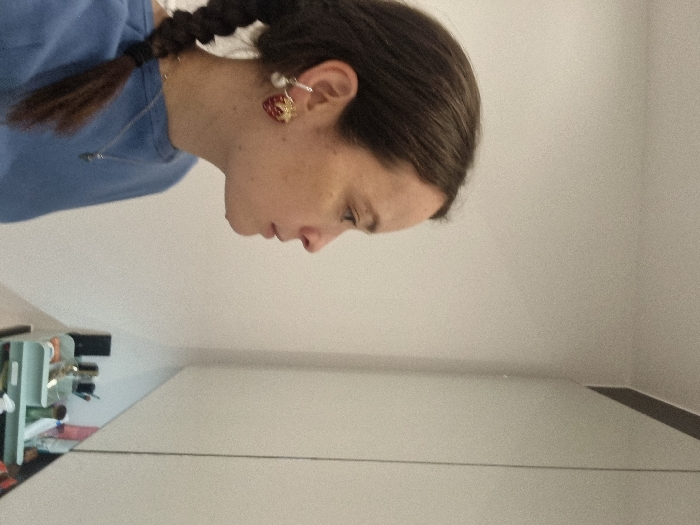 A female individual is depicted in a profile view, facing right, within an indoor setting in London, United Kingdom. She has dark brown hair styled in a visible braid over her left shoulder and fair skin. Her left earlobe features two earrings: an upper silver-toned hoop with a white pearl drop, and a lower red and gold-toned, possibly strawberry-shaped, earring. She wears a light blue long-sleeved garment and a thin silver-toned necklace with a small pendant. The background on the left is a plain light-colored wall. To the right, a light-colored cabinet or wall unit features a reflective surface on its lower portion, functioning as a mirror. Beneath this mirror, a counter displays a light blue-green organizer holding various small bottles, containers, and personal care items, alongside a dark rectangular object. The individual's gaze is directed towards the right side of the frame, presumably at her reflection or objects on the counter.