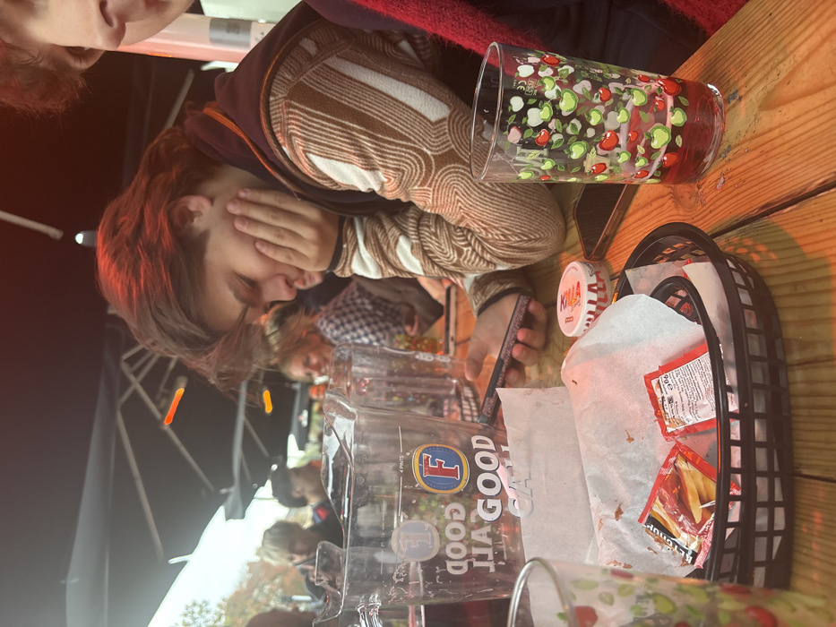 This image depicts an outdoor dining or drinking area, consistent with the patio of The Botanist restaurant/bar, located in Newcastle upon Tyne, United Kingdom. A young individual with medium-length brown hair, wearing a brown and white patterned long-sleeved top under a dark vest, is seated at a light wooden plank table. They are looking down at a smartphone held in both hands, with their right hand resting against their jawline. To their immediate right, another person's lower face and a red garment are partially visible. In the background, several other casually dressed individuals are seated at additional tables under large black awnings; one blonde-haired person is seen smiling. On the table in the foreground: a large clear plastic pitcher, partially filled with a dark liquid, displays "GOOD ALL GOOD" text and a blue "F" logo (Fosters). To the right, a clear glass with a red and green apple pattern contains a small amount of reddish liquid. A black plastic basket holds two red ketchup sachets (Heinz brand visible) and is lined with white paper. A white circular container with red lettering, identifiable as "KILLA" nicotine pouches, sits on the table near the central figure's left hand, alongside another smartphone. The scene is illuminated by warm, reddish-orange artificial light, contrasting with the lighter, overcast sky visible in the upper left background, where out-of-focus foliage is present.