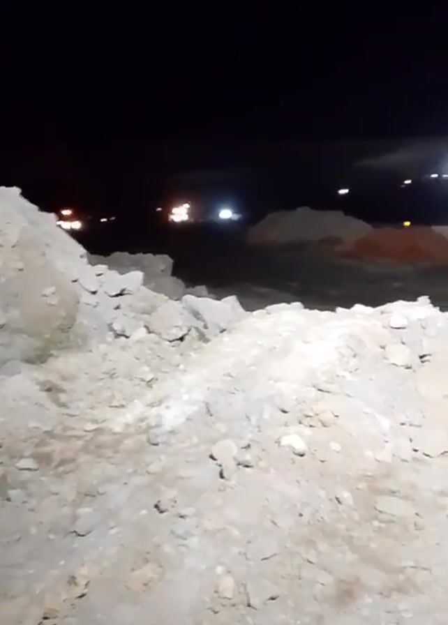 man reading a book on a pile of dirt at night. There are lights in the distance and a blurred view of ground around the dirt pile. The man is wearing a blue hoodie and jeans and sitting cross-legged. He appears to be alone. The scene is dark, illuminated by the lights in the distance. The camera remains stationary for the duration of the video.