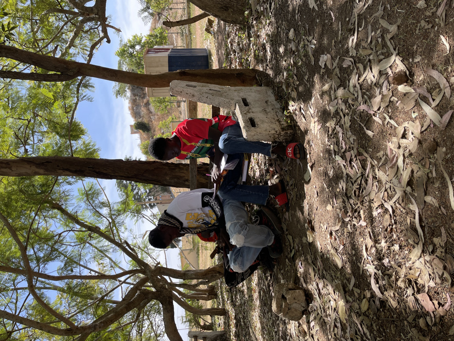 The scene depicts two males seated outdoors under the shade of deciduous trees in Durimi, Nigeria