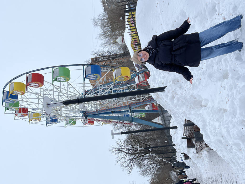 A Ferris wheel dominates the left side, featuring cars colored in red, yellow, green, and blue. To the right, a woman in a dark coat and jeans stands atop a snowdrift. The background reveals trees and buildings, suggesting an urban park setting. A row of park benches sits along a walkway covered in snow, with people walking in the distance. The sky appears overcast, indicating a winter season.