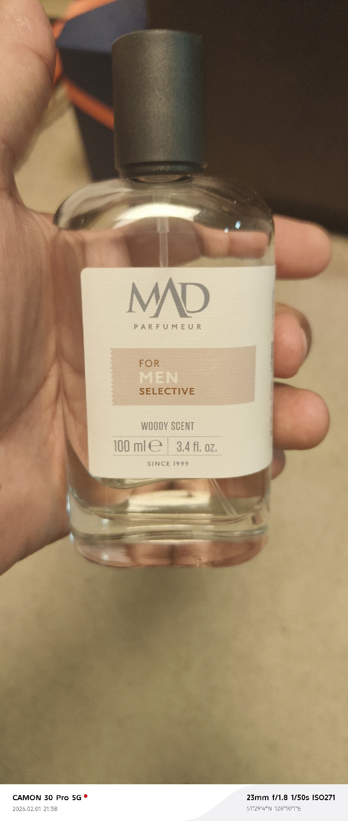 The image displays a clear glass spray bottle, identified as "MAD PARFUMEUR FOR MEN SELECTIVE," containing a clear liquid labeled "WOODY SCENT." The bottle, with a dark grey cap, indicates a volume of "100 ml e | 3.4 fl. oz." and states "SINCE 1999." An individual's hand, partially visible, holds the bottle vertically. The background is a soft-focus blend of dark brown and black tones, suggesting an indoor, dimly lit environment. Metadata at the bottom of the image indicates it was captured on 2026.02.01 at 21:58 by a CAMON 30 Pro 5G, with camera settings of 23mm f/1.8, 1/50s, ISO271. The GPS coordinates provided are 51°29'4"N 128°10'7"E, locating the scene within the Amur Oblast region of Russia, consistent with a Tecnimont camp.