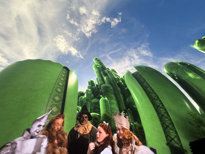 low-angle view of the Emerald City from "The Wizard of Oz," superimposed with the main characters from the film