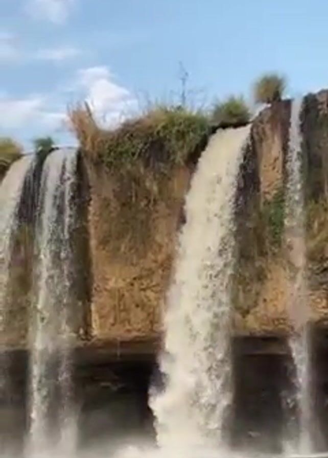 low angle view of a waterfall. The waterfall has four or five separate streams of water flowing over a cliff. The cliff is made of light brown earth and topped with greenery. The sky is blue with light clouds. The water at the bottom of the waterfall is calm.