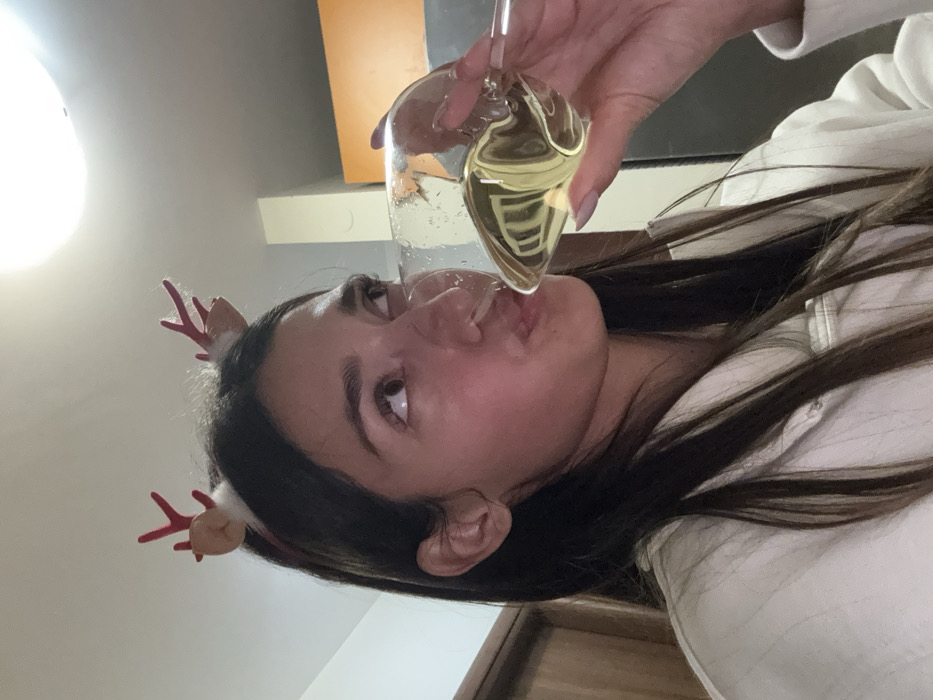 A young woman wearing reindeer antlers tilts her head back to drink from a stemmed wine glass. The glass is filled with a light-colored liquid. She is wearing a white shirt with buttons. The background shows a wall and the ceiling is visible in the upper left. The image is taken from a low angle, looking up at the woman.