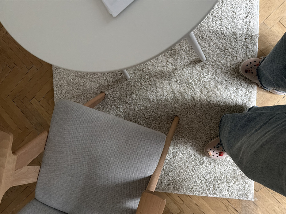 An overhead first-person perspective captures an indoor scene in Moscow, Russia. A person, whose lower legs and feet are visible, stands on a rectangular, light-colored shaggy rug. The individual wears blue denim jeans and light pink Crocs adorned with multi-colored Jibbitz charms. To the immediate left, a light grey upholstered armchair with natural wood armrests and legs is partially visible. To the right, a segment of a white round table with white legs extends into the frame. The rug is positioned on a polished wooden floor featuring a herringbone pattern.