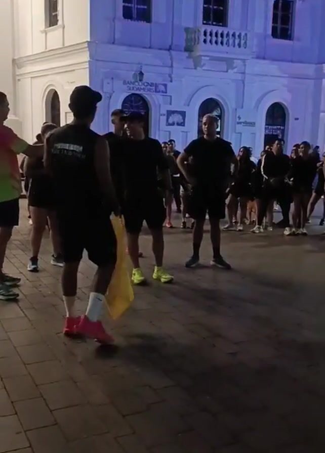 A group of approximately 20 people are gathered on a cobblestone plaza in front of a large, white building illuminated with purple light. The people are mostly dressed in dark athletic clothing, some with brightly colored running shoes. One person in the foreground is holding a yellow bag. They appear to be listening to someone who is standing near a black speaker. The building in the background features arched windows and a prominent facade. The overall setting suggests an organized group activity, possibly a running club or tour, taking place in an urban environment at night.