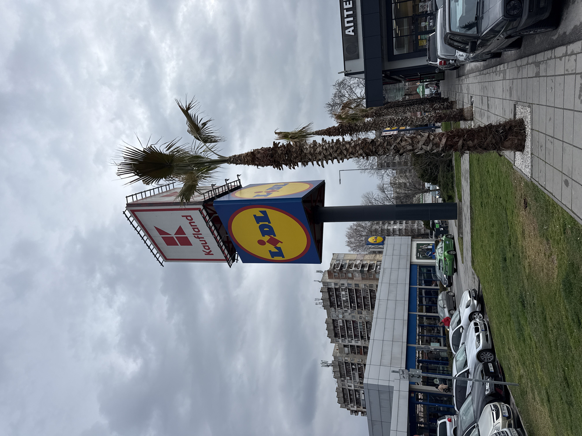 The image displays an urban commercial and residential scene in Plovdiv, Bulgaria, under an overcast sky. A prominent, tall pylon sign stands centrally, featuring a red "Kaufland" logo on a white background at its apex, surmounting a large, cubic sign with the yellow, red, and blue "Lidl" logo visible on at least two sides. To the left, a modern retail building, identified as a Lidl supermarket by a smaller logo, features a grey facade with blue window accents and large glass entrance doors. A parking lot in front of this building contains multiple parked cars, including a silver BMW with a Bulgarian license plate "PB 7691 PE," and a silver Mercedes-Benz with "PB 5780 KX." A person wearing a red jacket is visible near one of the parked silver cars. In the background, two large, multi-story concrete residential buildings with balconies and rooftop antennas are visible. To the right of the pylon sign, a row of at least five tall palm trees with textured trunks lines a paved sidewalk. Adjacent to the sidewalk, another building displays a sign reading "АПТЕКА" (Pharmacy). Additional cars are parked along this sidewalk, including a dark grey Volkswagen Golf with "PB 6204 HA." Several individuals are present, with one near the Lidl entrance and another near the pharmacy. A green vehicle, possibly a taxi, is also visible further into the parking area.