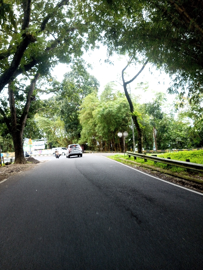 The image captures a paved, two-lane asphalt road in Kodarapalli, India, viewed from a low perspective looking forward along its course. The road exhibits a dark, even surface with a solid white line delineating its right edge. A metal guardrail parallels the right side of the road, behind which dense, bright green ground vegetation is visible, leading to a cluster of tall, slender trees, possibly bamboo, further into the background. Two streetlights are positioned on the right side beyond the guardrail. The left side of the road features the base of a large tree and a low concrete barrier with multi-colored painted elements. The upper portion of the scene is dominated by a dense canopy of large-leafed green trees, casting significant shade. Three vehicles are observed traveling away from the viewer: a light-colored SUV or crossover centrally located in the right lane, a white sedan partially obscured behind it, and a motorcycle with a single rider positioned to the left of the SUV. The sky is largely obscured by the overhead foliage.